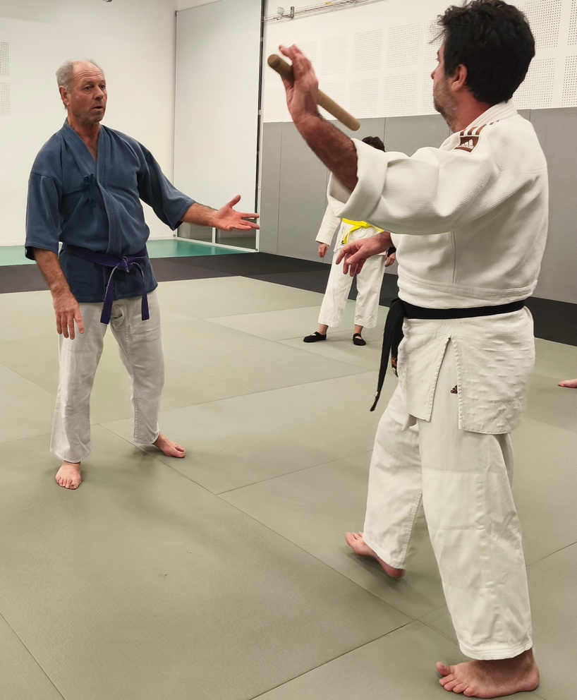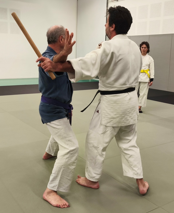 Accueil » AIKI-JUTSU » Stopper une attaque au bâton court circulaire de coté