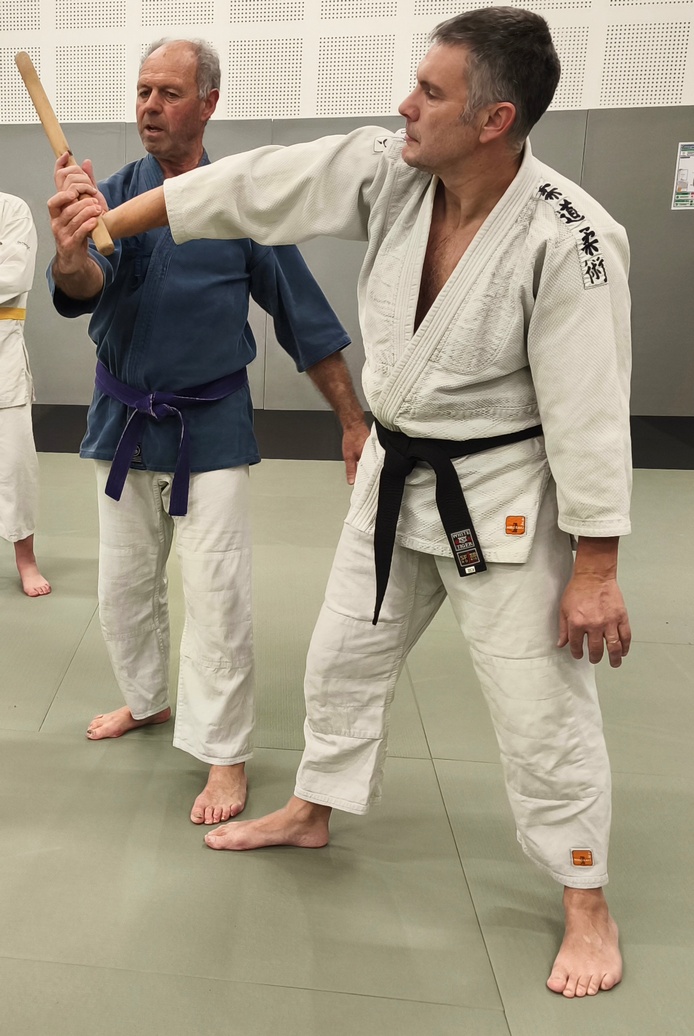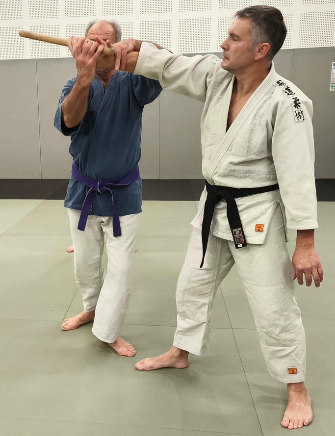 Nouvel article de présentation de techniques permettant de stopper une attaque au bâton court circulaire, par un tsuki immédiat ou par esquive, suivi d’une clé au bras.